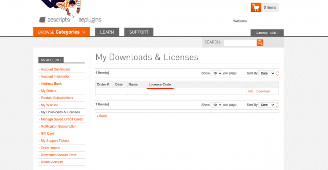 2.「aescripts+aeplugins」のマイページから購入履歴へ。「order」の中の「License Code」という文字をみつけます