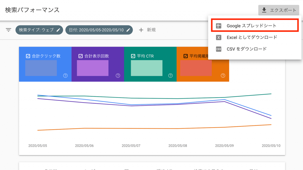 Googleサーチコンソールで 『アップデートが行われた日付以前』 と 『アップデートが行われた日付以降』 を指定し、「エクスポート」→「Googleスプレッドシート」で書き出します。